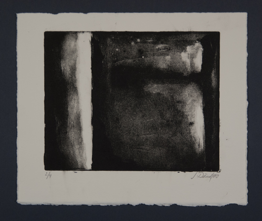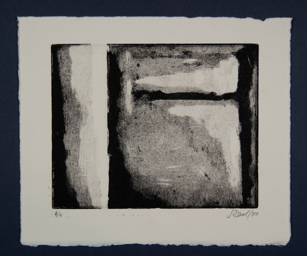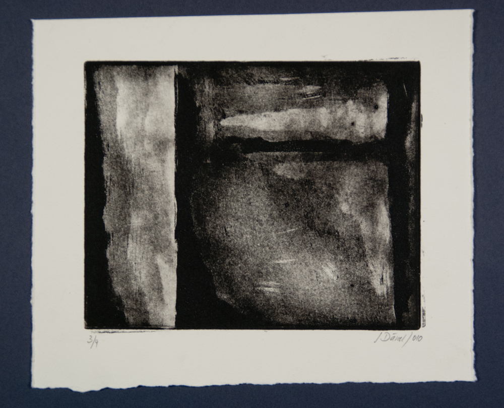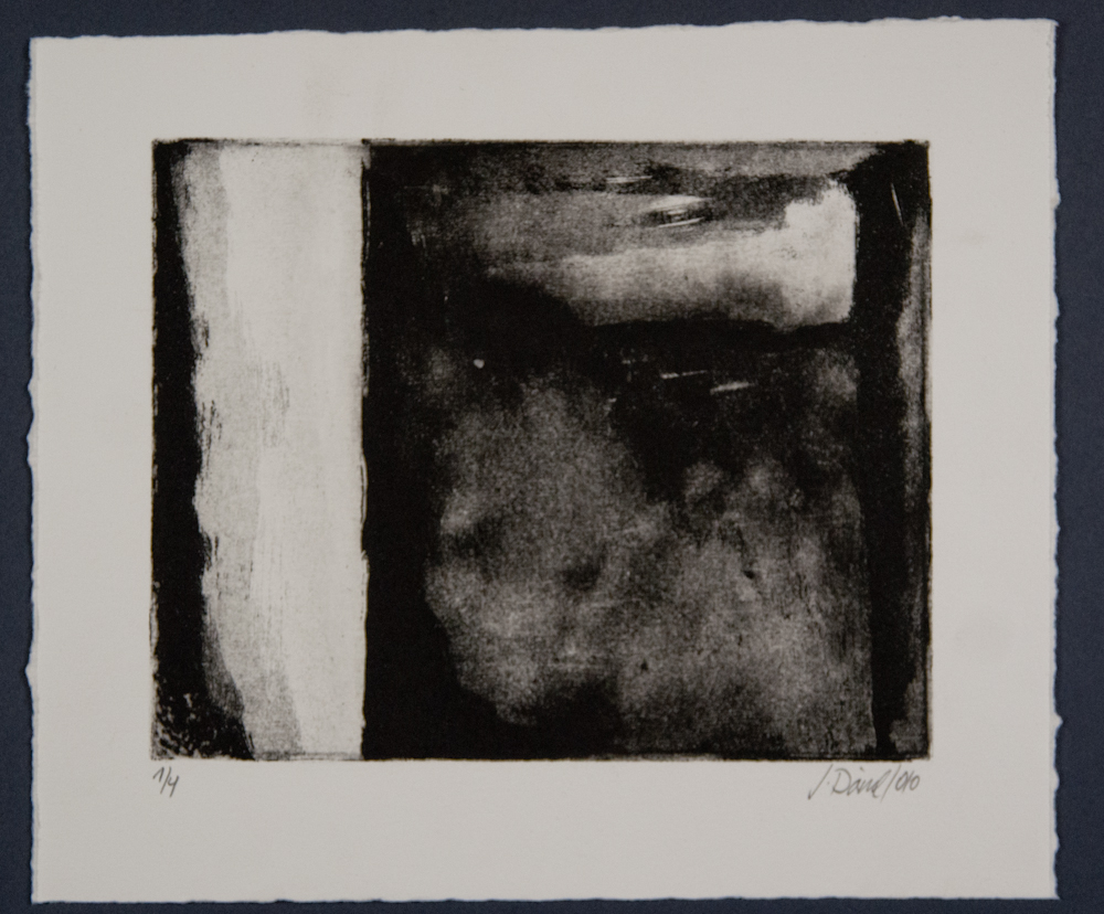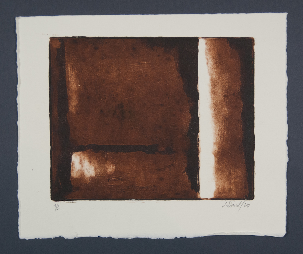 Diese Aquatinta aus dem Jahr 2010 liegt in einer Auflage von 2 und 4 Exemplaren vor. Die Auflagen unterscheiden sich in der Ausrichtung des Motivs. Jedes Blatt bedient sich des selben Grundmotivs, aber die Intensität des Farbauftrags variiert.