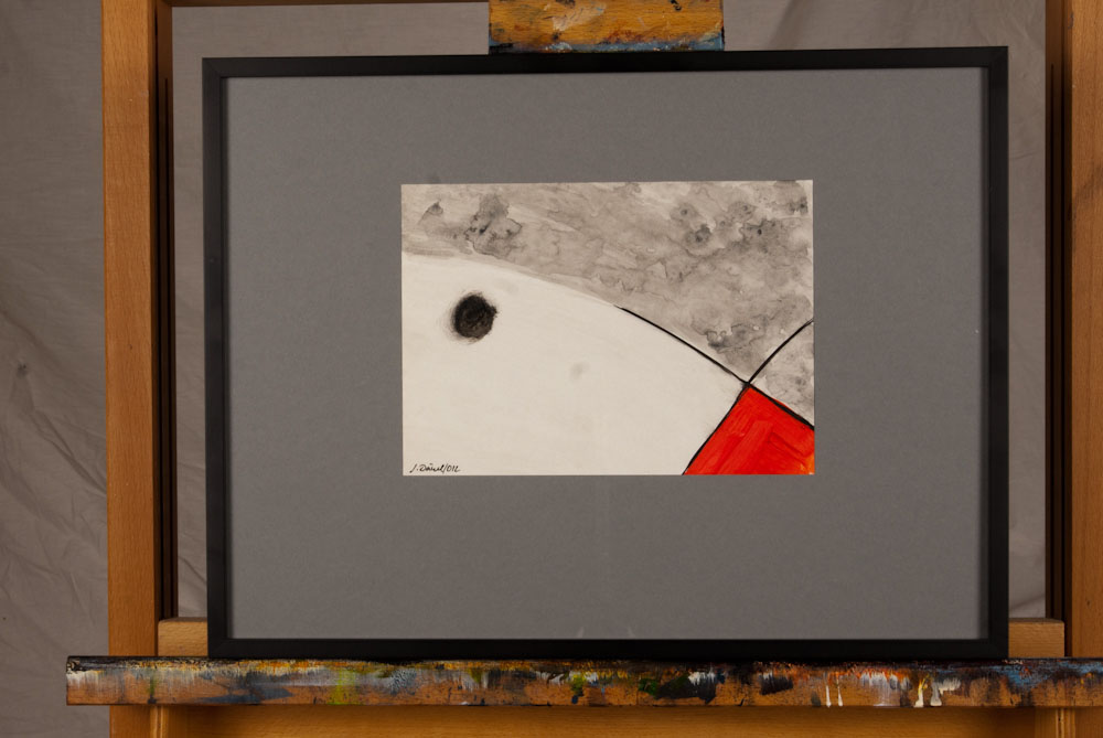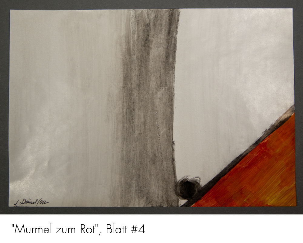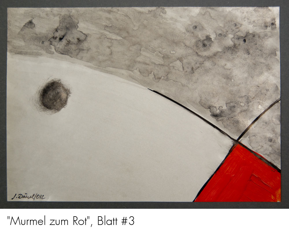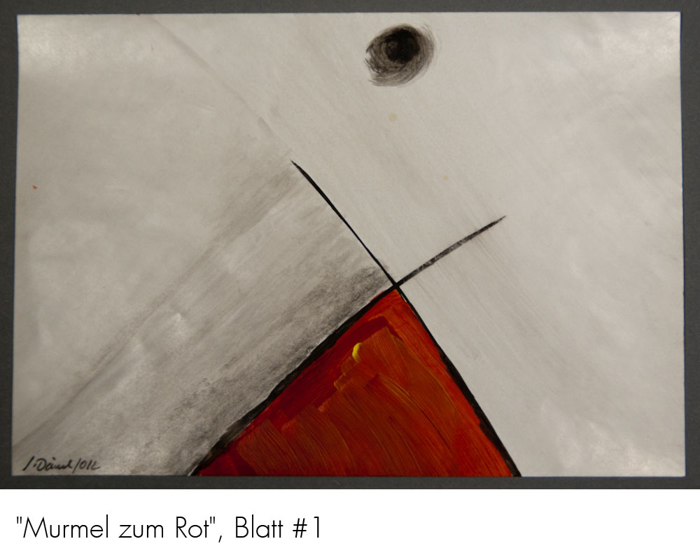 Eine Studie über das Verhalten der Murmel im freien Fall. Bis hin zum Verkeilen zwischen Ebene und Wand. Eine Serie von vier Zeichnungen, die in Mischtechnik, Tusche und Acryl, ausgeführt wurde. Jedes Blatt dieser Serie ist ein Unikat.